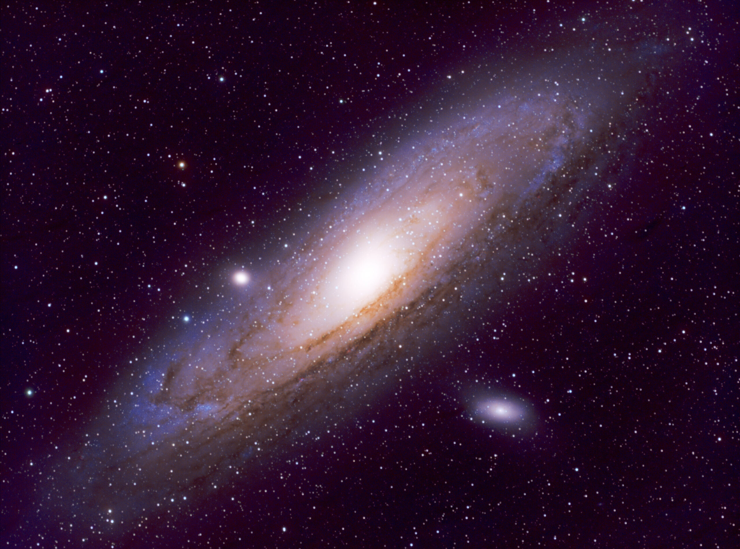Ebenfalls gut zu erkennen sind die beiden Satellitengalaxien M32 und M110, die sich im Schwerkraftfeld der Andromedagalaxie bewegen.